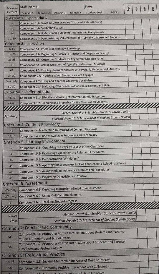 As the parents implemented the new Walking Program, they were informed and mandated to attend several evening professional development classes in order for them to understand the new Parental Evaluation System. You know, the one in which they had to show evidence of the 41 Elements within the Domains through the Elements based on the Components to see whether they were on track to meet the Criterion?