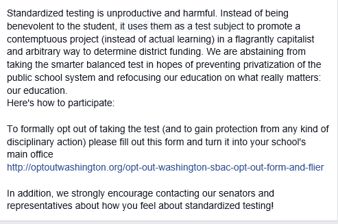 I was in Algebra 2 this a.m. when my teacher started to excuse the juniors in my class to practice for the Smarter Balance Assessment. I stood up in the back of the room where my desk is and said, “You do NOT have to take the test, you can opt out.”